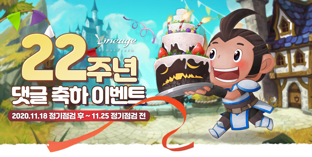 ● 참여 방법: [홈페이지-소식-아덴월드-메티스 노트-22주년 댓글 축하 이벤트] 페이지로 이동하여 해당 게시글에 리니지 22주년을 축하하는 댓글을 작성해 주세요.