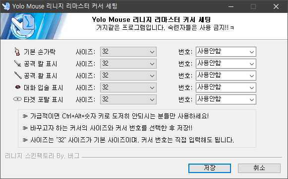 리니지 커서 세팅을 실행하여 바꾸고자 하는 커서의 사이즈와 번호를 선택한 후 저장!!